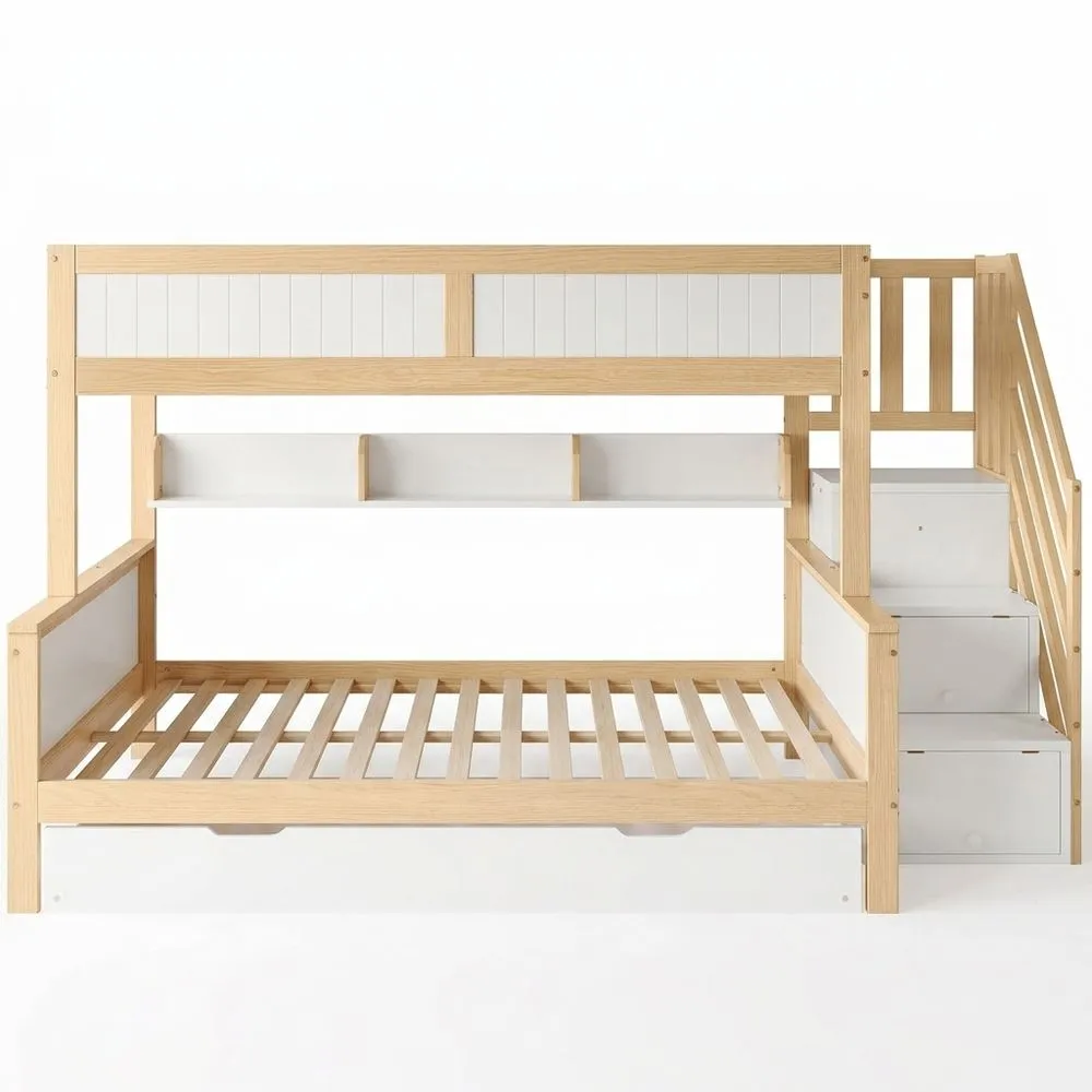 Diseño que ahorra espacio - Las camas dobles ofrecen opciones de descanso flexibles. La cama plegable (90 x 190 cm) se puede retirar y guardar fácilmente, conveniente para habitaciones pequeñas o invitados nocturnos. Espacio de almacenamiento - Con un estante abierto debajo de la cama, los niños pueden guardar libros, juguetes y otros artículos. La litera también incorpora un armario con puerta, favoreciendo un ambiente organizado y limpio. Escalera con almacenamiento - La escalera incorporada ofrece 4 gabinetes amplios para guardar ropa, juguetes u otros objetos personales. Construcción segura y resistente - Con cuatro lados resistentes, proporciona seguridad extra. El marco fuerte asegura soporte y durabilidad. Combinación práctica - La mezcla de colores blanco y madera se integra fácilmente en varios estilos de interior para satisfacer diferentes necesidades estéticas. Tamaño del colchón: 90 x 200 cm y 120 x 200 cm, grosor recomendado 13 cm. La litera ofrece una solución flexible que ahorra espacio. En un lado de la cama hay un armario de techo a suelo. Los cajones debajo de las escaleras son para artículos personales, mientras que un armario de malla es adecuado para ropa de cama plegada.